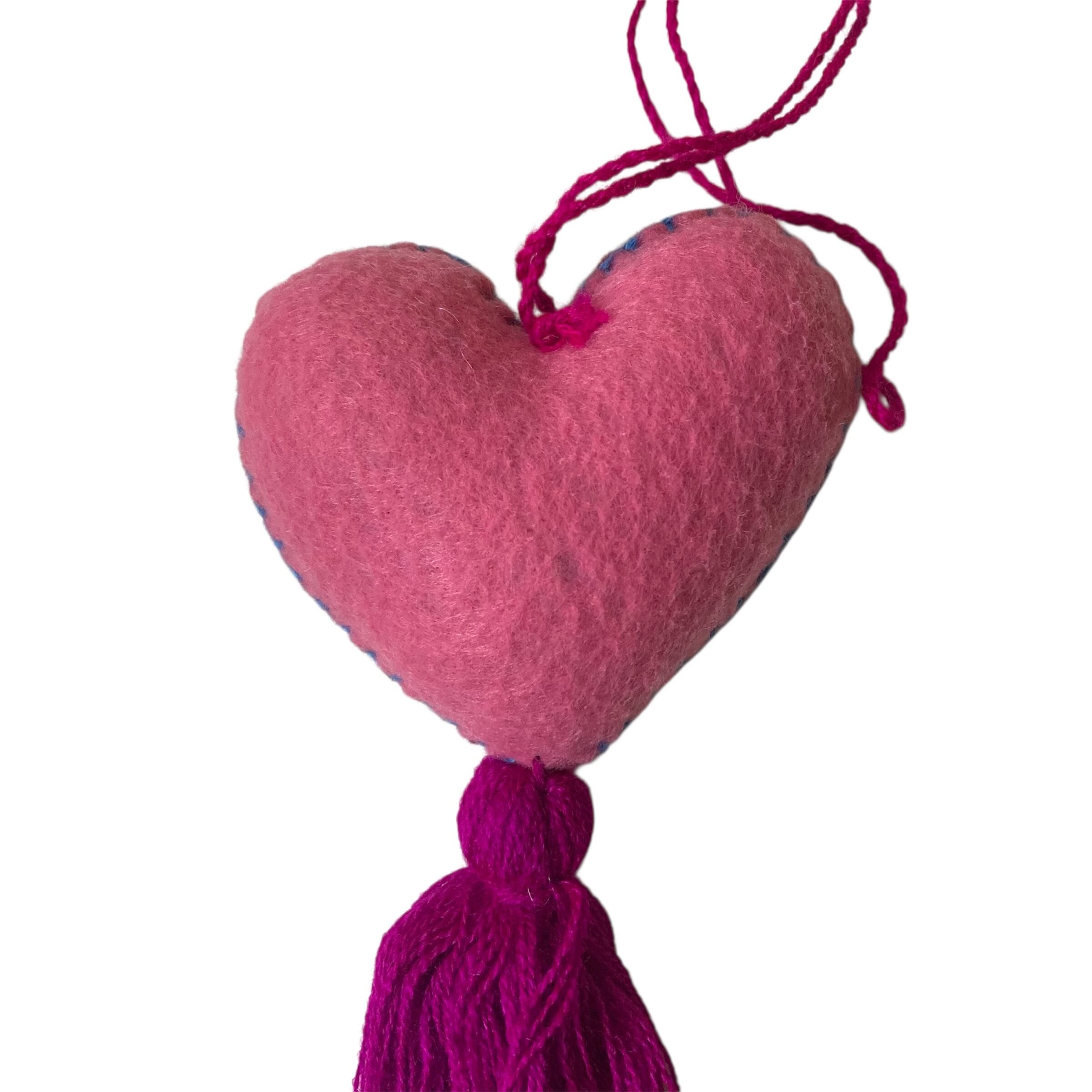 ハートにかたどったフェルト生地にロココ刺繍が施され、メキシコらしさと作り手の温かみを感じられる手縫い手刺繍のチャームです。(ロココは縫い針の周りに糸をグルグル巻いて作るステッチが特徴の刺繍)