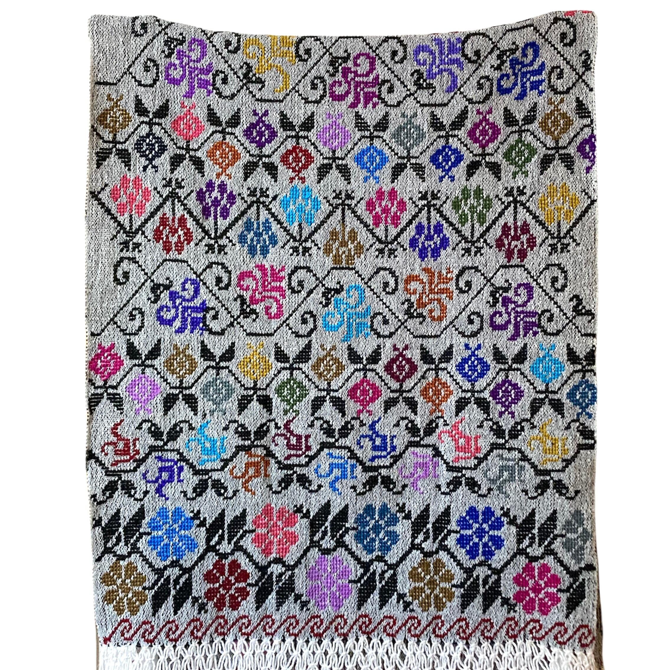 手織り生地に約1ヶ月の時間をかけてクロスステッチ刺繍で花模様を描いた贅沢な1枚。