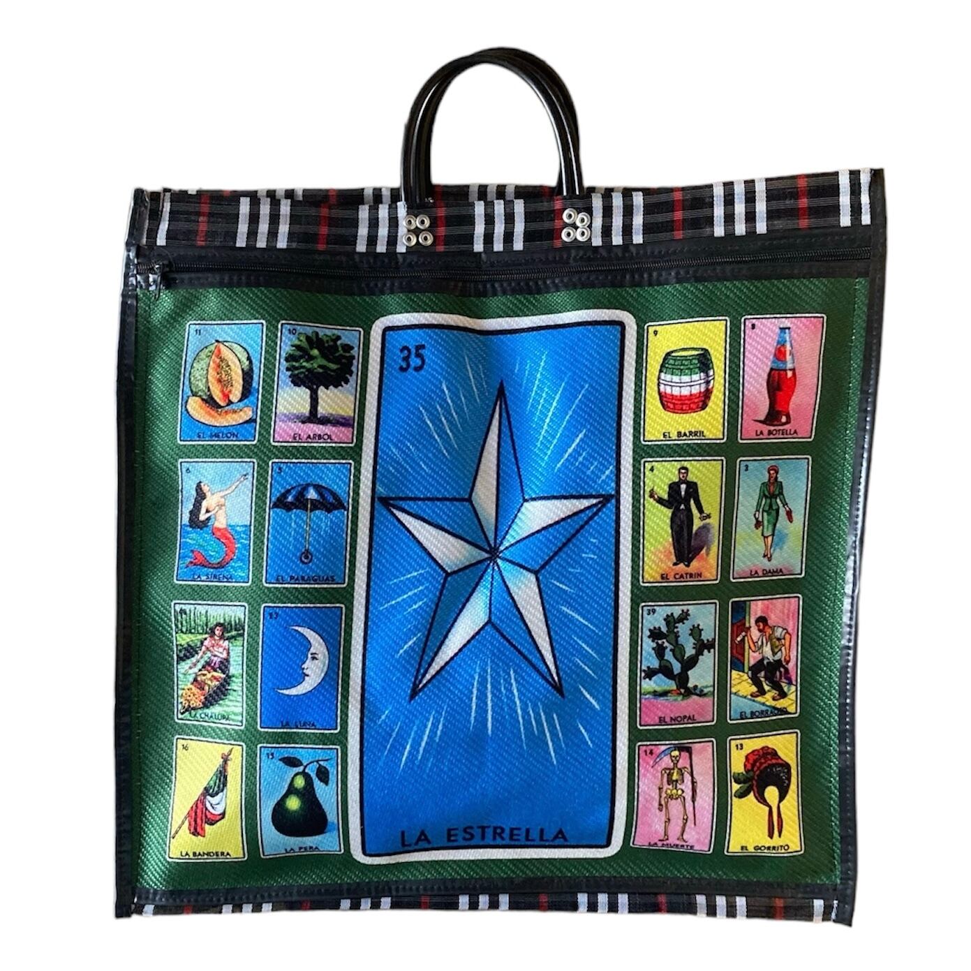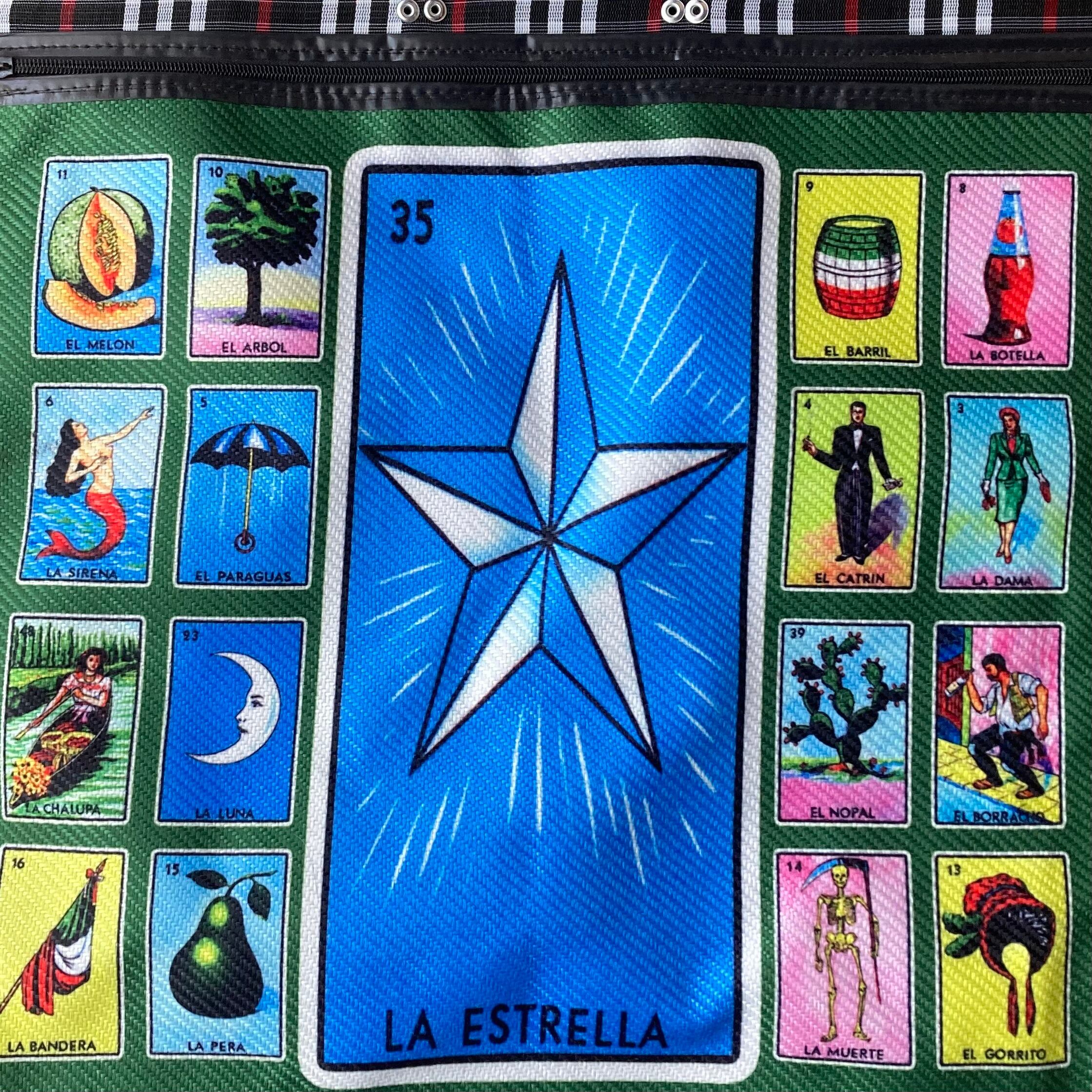 前面の大きなポケットにはメキシコのカードゲーム”ロテリア”がプリントされています。使わない時は折りたたまずに、飾る収納としてお部屋の装飾品にもなりますよ♪